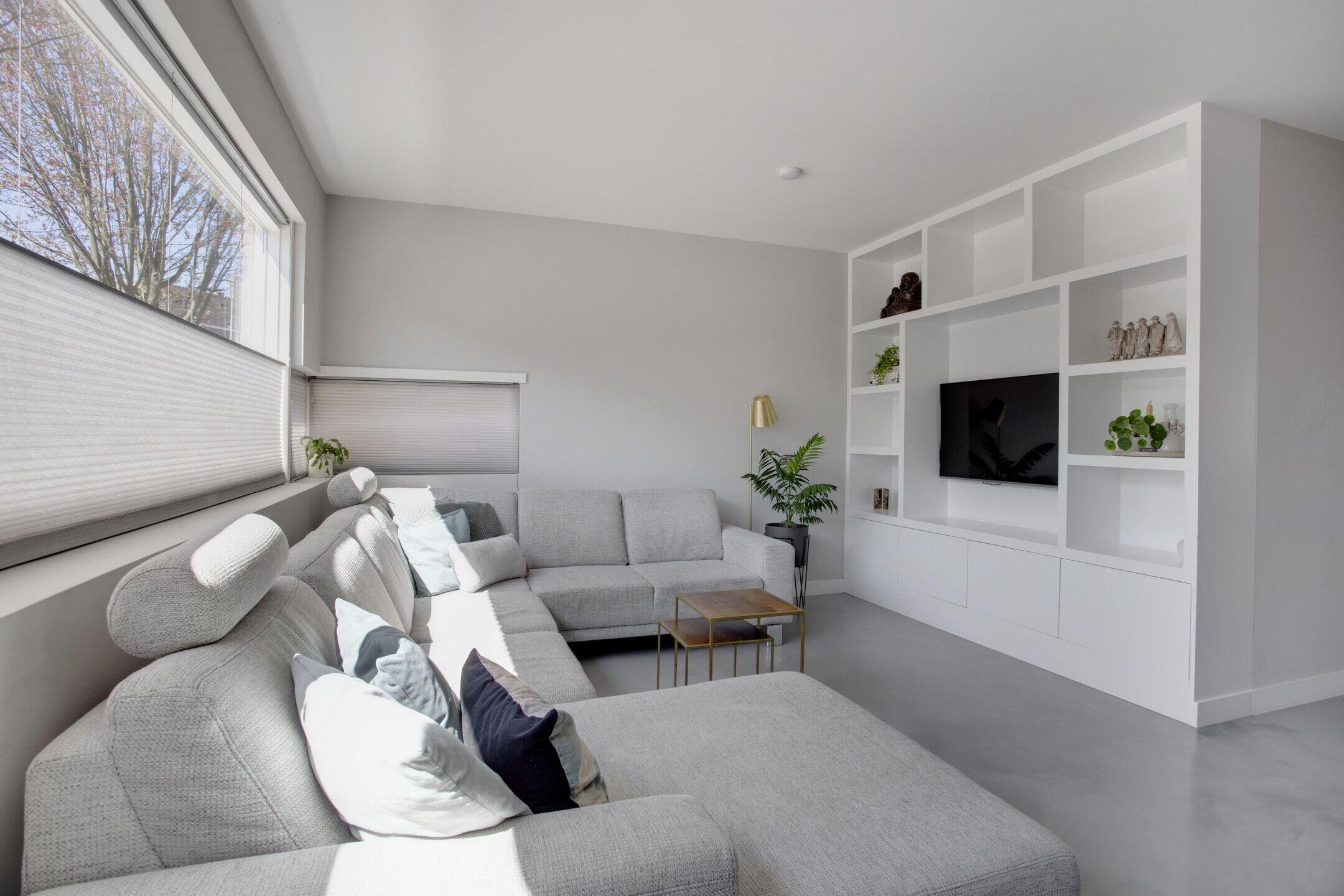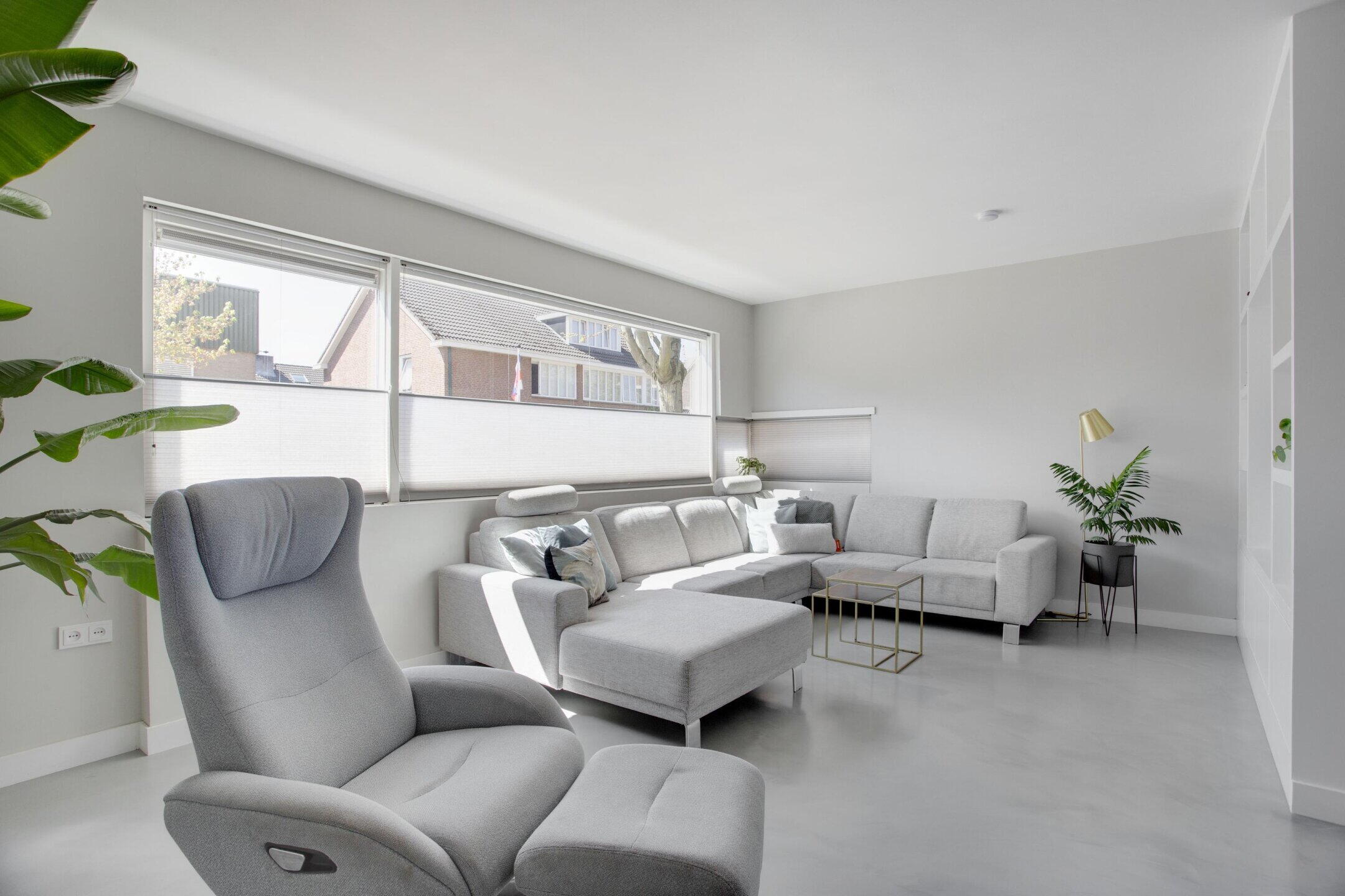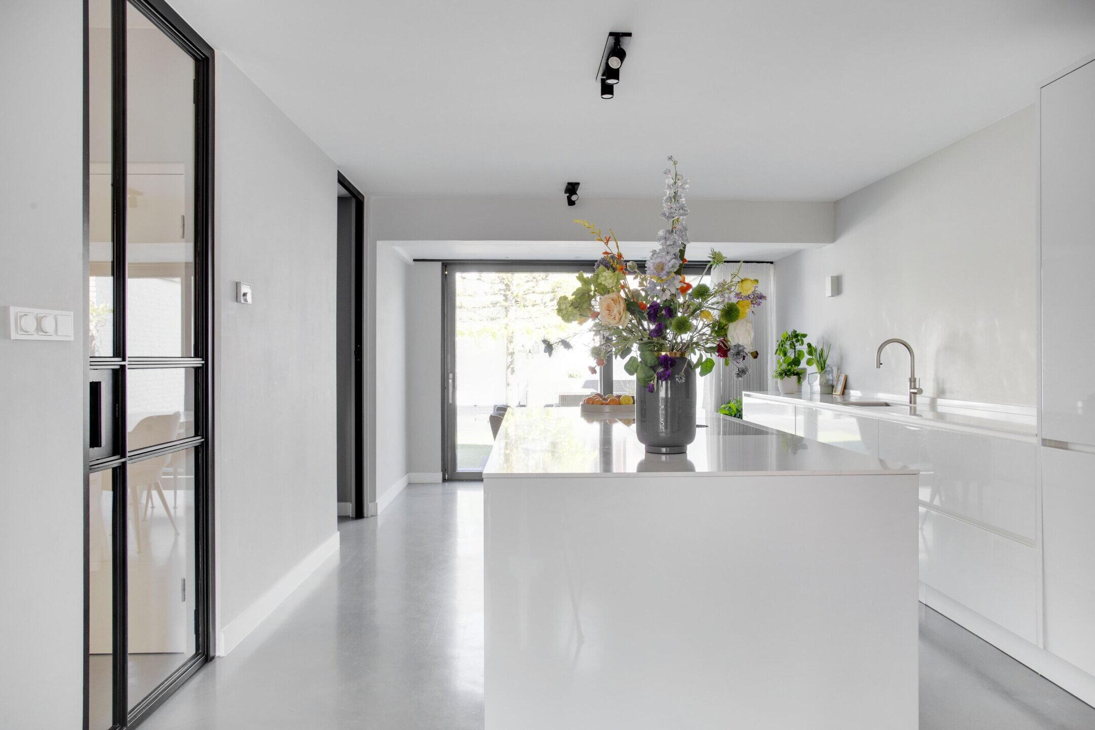 De begane grond vormt het kloppend hart van het huis. De woonkamer van circa 23 m² en de royale halfopen keuken van circa 24 m² lopen vloeiend in elkaar over en zijn afgewerkt met een moderne gietvloer, die zorgt voor rust, eenheid en een eigentijdse uitstraling.